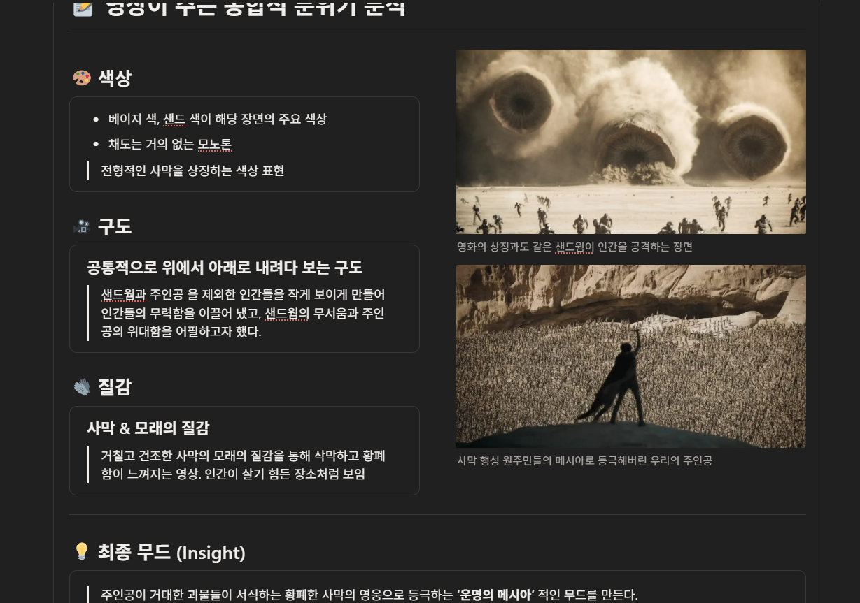 영화 듄을 매우 좋아 했었는데 분석을 통해서 한층 더 영화의 매력을 깨달을 수 있어서 좋았다.